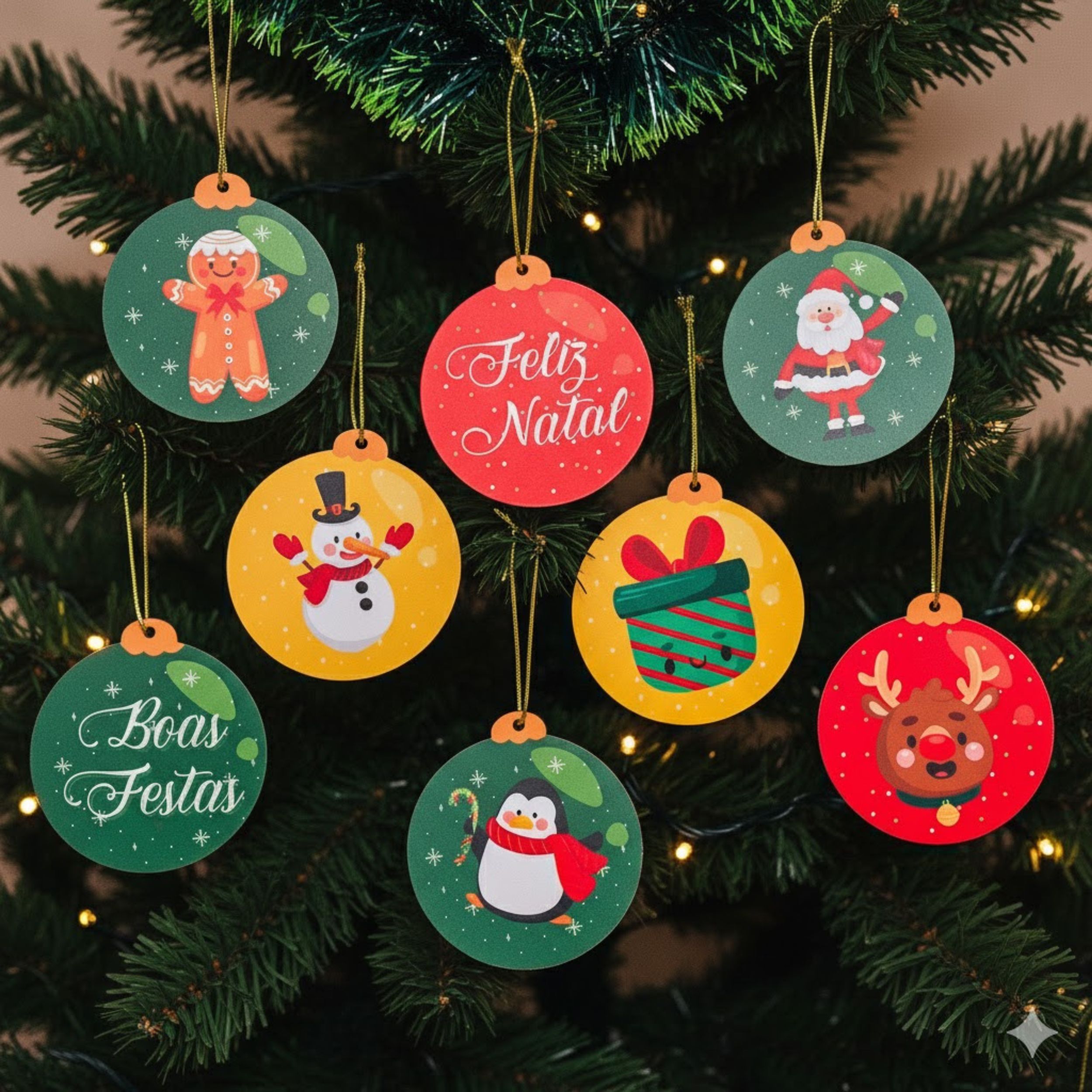 O kit contém 8 unidades diferentes, com personagens e frases clássicas do Natal — o toque perfeito para transformar sua árvore em um verdadeiro cenário encantado!